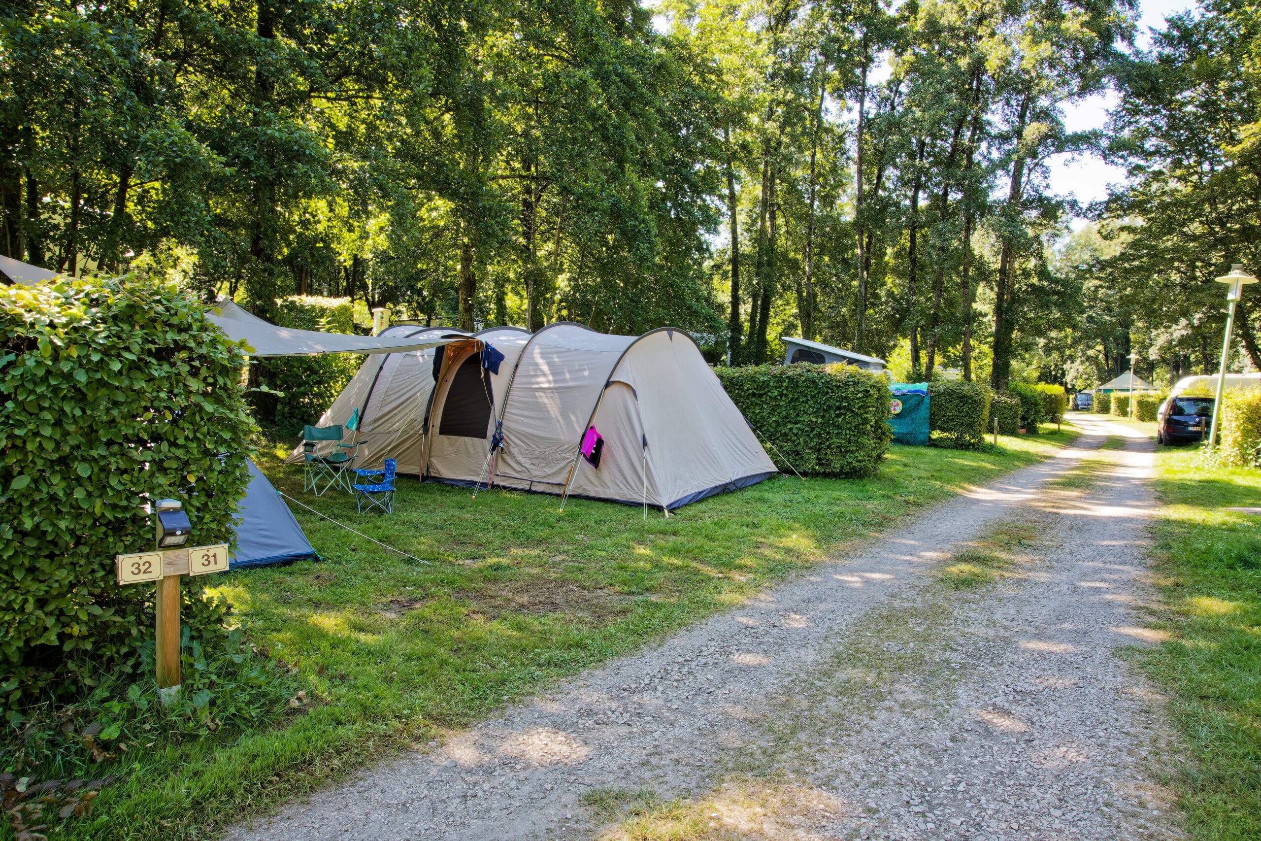 Grand emplacements de 100 m ² minimum pour tente, caravane ou camping-car. (véhicules double essieux interdits)